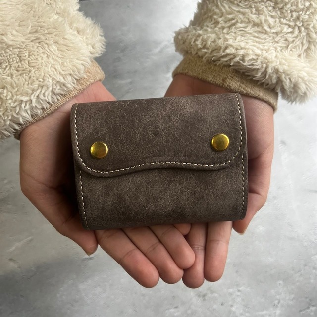 コロンとした姿に、笑っている様な顔。 手のひらに収まるサイズ感でありながら、小さいのに大容量という特徴の三つ折り財布。 日常使いやお出かけの際に、必要なものをしっかりと収納できます。 ・「ポケットが小さいけれど、カードもお金もしっかり持ち歩きたい…」 ・「バッグが小さいから、財布もコンパクトにしたいな…」 ・「デザイン性も重視したいけど、機能性も譲れない…」 これらの悩みを解消するのがこの「コンパクト三つ折り財布」です。 洗練されたデザインは、スタイルを選ばず、どんなシーンでも活躍します。 まず外装ホックを外すとお札入れ、内装のホックを外すとカードポケットや小銭入れがしっかり配置されているため、機能性も抜群です。 《推奨収納量》 ・お札10枚(札押さえが広くて安心) ・カード10〜12枚(カードポケットが4部屋で仕分けできる) ・小銭10〜15枚(マチが広めで見やすい) また、外装部分は縁を革で包み込む技法『ヘリ返し』で仕立てました。 これにより、手触りが良くなるだけでなく、縁も強度の向上にも貢献しています。 革の素材には、表面をわざとブラシで引っ掻く事で和紙のような独特な風合いを生む技法「スクラッチ加工」が施されたイタリアンレザーを使用。 使うほどに深い味わいを醸し出し、長く愛用できる一品です。 この革の風合いを活かしたシンプルなデザインを心掛けました。 このお財布専用ボックスにお入れしてお届け致します。 《スペック》 【革カラー】 グレー 糸色は全てベージュ 優しい印象を持つ色で、真鍮金具との組み合わせが上品。 エレガントな雰囲気が漂う大人なグレーなお財布です。 通常展開色(5色展開)はこちら↓ https://anbow.theshop.jp/items/129010655 【本体サイズ】縦72mm×横95mm×厚さ35mm 【重さ】 約80g 【素材】植物タンニン鞣しイタリアンレザー (スクラッチ加工レザー) 【金具】真鍮ホック ーーー素材についての特徴と注意点ーーー 植物タンニン鞣しで染料仕上げ、オイルがしっかり入った革なので、使い込むほどに味わい深い色に変化し、自然な艶が出て来る、経年変化(エイジング)を愉しんでいただける革です。 表面はスクラッチ加工によりざらついたタッチ感でマットな印象ですが、使い込むほどに通常の銀付き革以上の艶がでる、経年変化の振り幅が魅力の革です。 また、スクラッチ加工のムラも絶妙で、テクスチャーとしても魅力を感じる仕上がりとなっています。 このレザーは天然の染料仕上げのため、生産時期や季節により多少の色むら・色ブレが発生しますのでご理解下さい。 ーーーーーーーーーーーーーーーーーーーーーーーーーーーーーーー レディース メンズ 母の日 父の日 敬老の日 クリスマス X'mas 誕生日 結婚祝い ウエディング 結婚記念日 退職祝い 還暦祝い プレゼント 春財布 バレンタイン ホワイトデー ペア おそろ 成人の日 卒業祝い 入学祝い 就職祝い 新生活 ミニマリスト ミニウォレット コンパクトウォレット コンパクト財布 小さい財布 ミニ財布