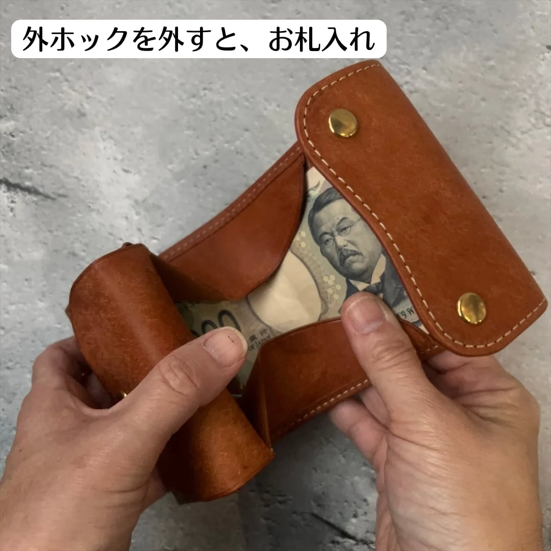 まず外装ホックを外すとお札入れ、内装のホックを外すとカードポケットや小銭入れがしっかり配置されているため、機能性も抜群です。