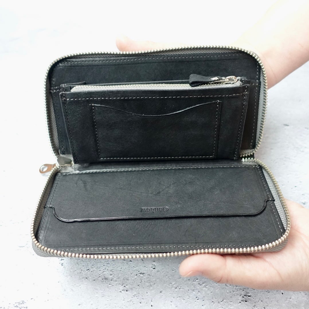 独自のレイアウトにより、ファスナーを開けた瞬間に目的のカードやお札へ最短でアクセス可能です。