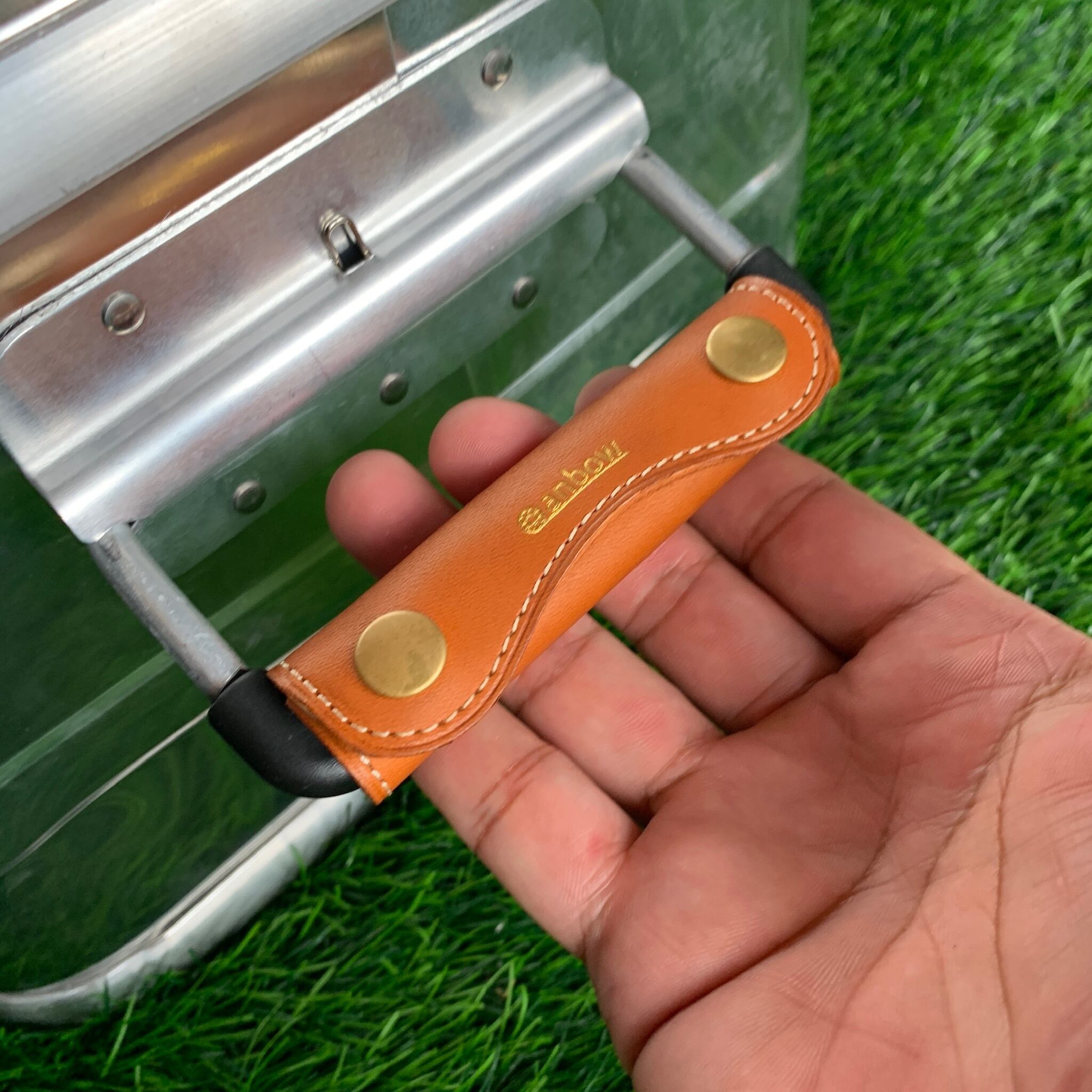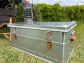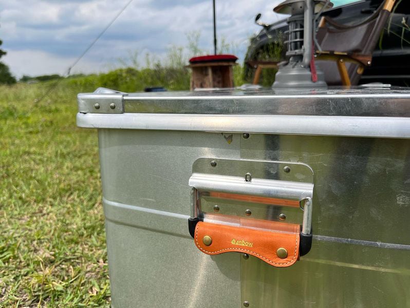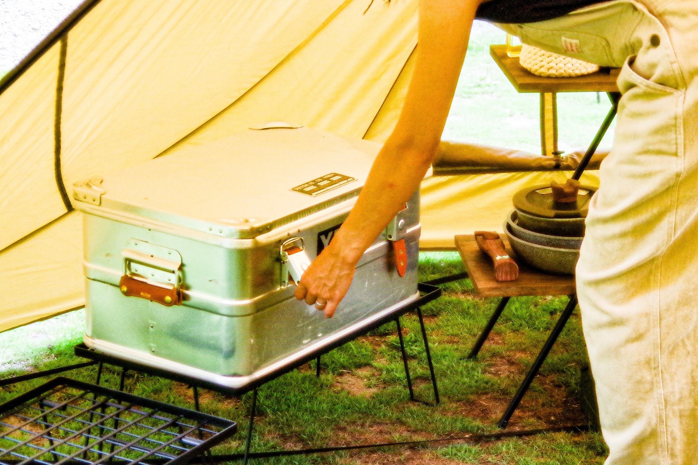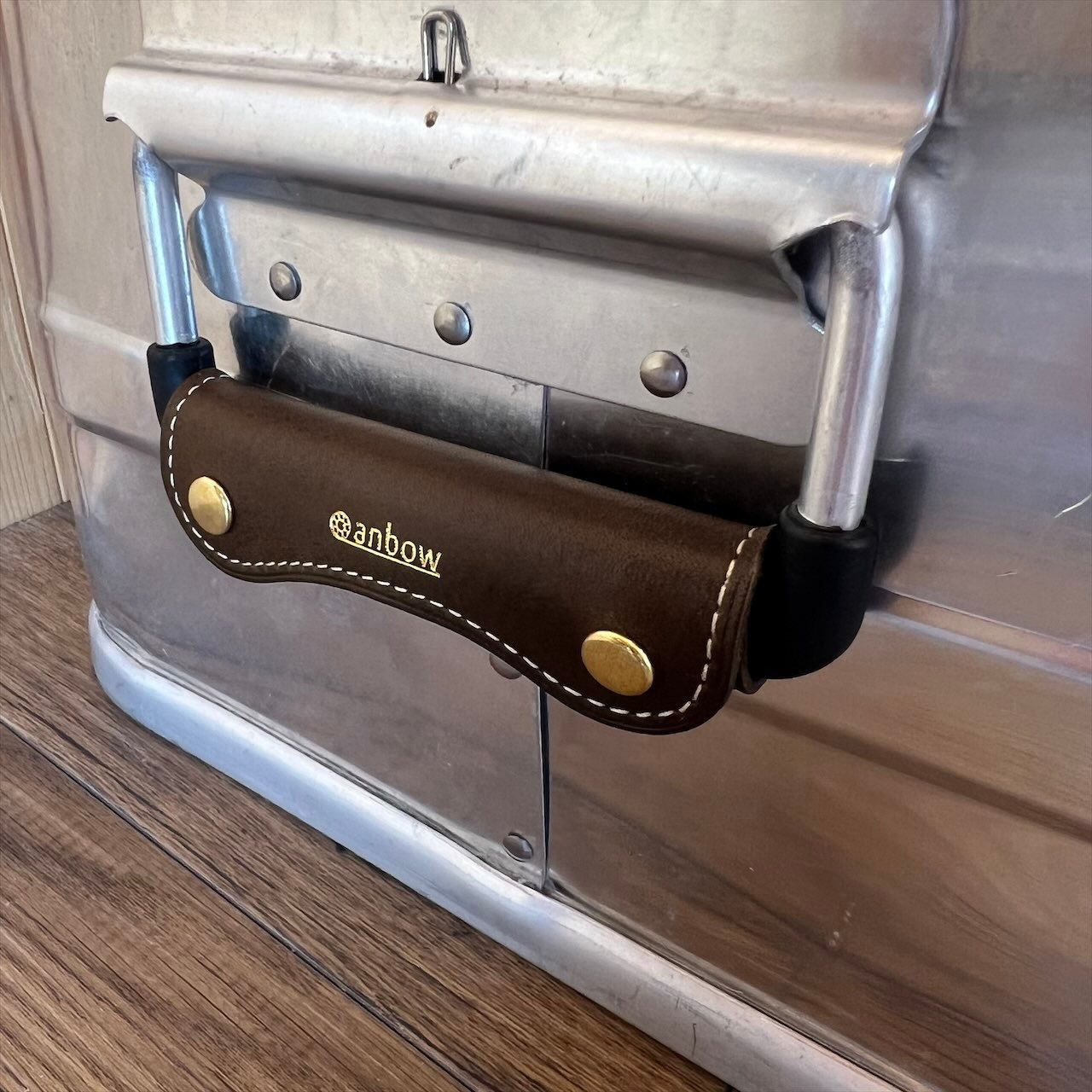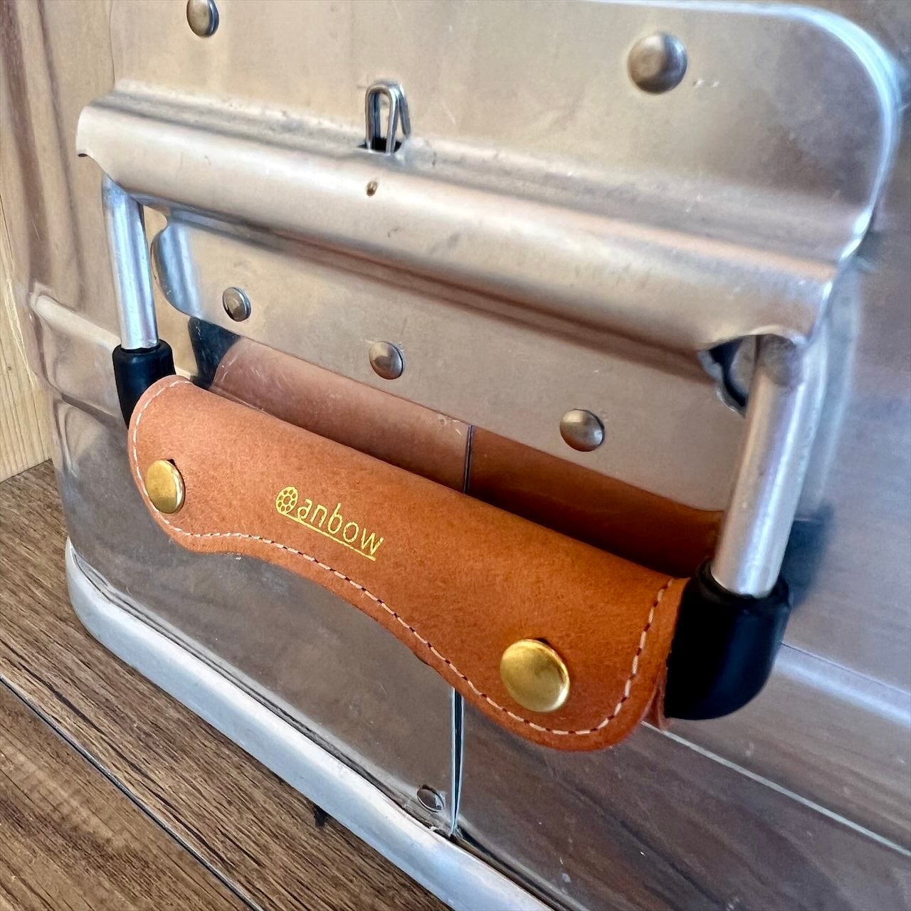 レザーカバーを装着することで手にかかる荷重軽減と、デザイン性を両立させた無骨なアルミコンテナを「映える道具」に変えてくれるアイテムです。