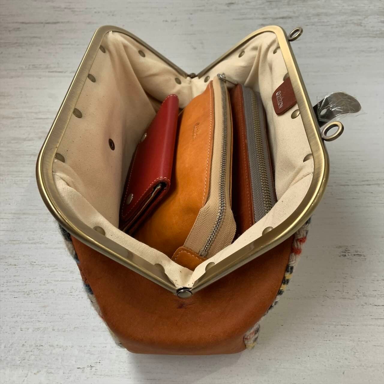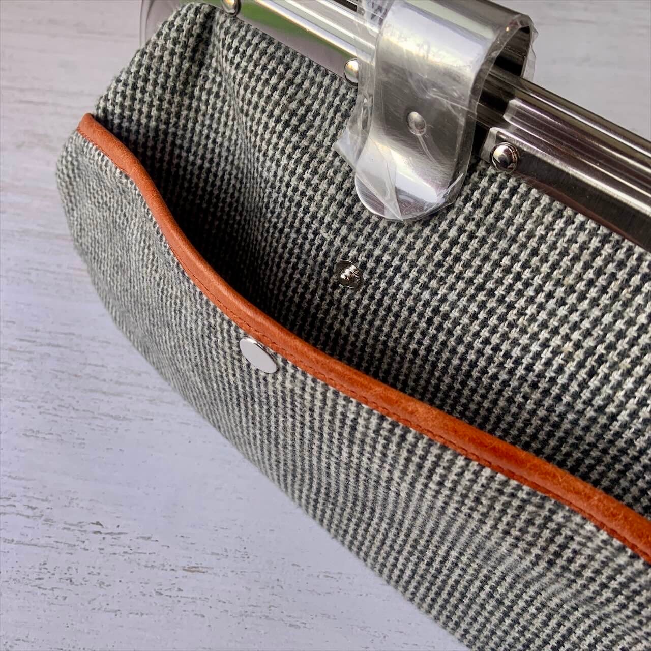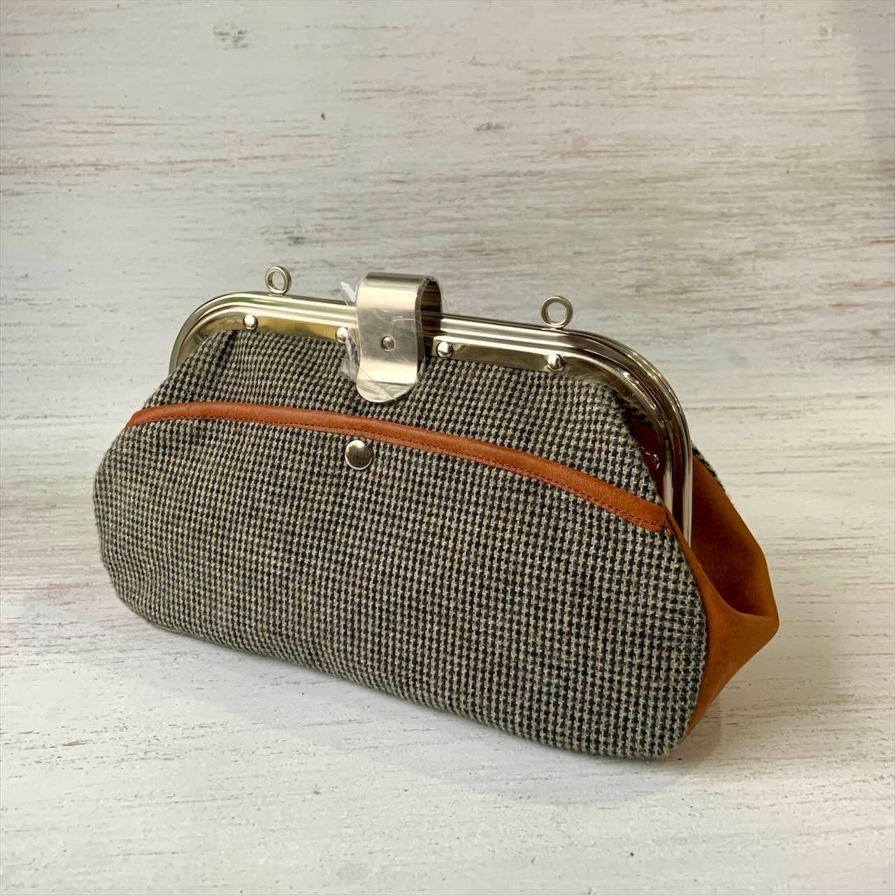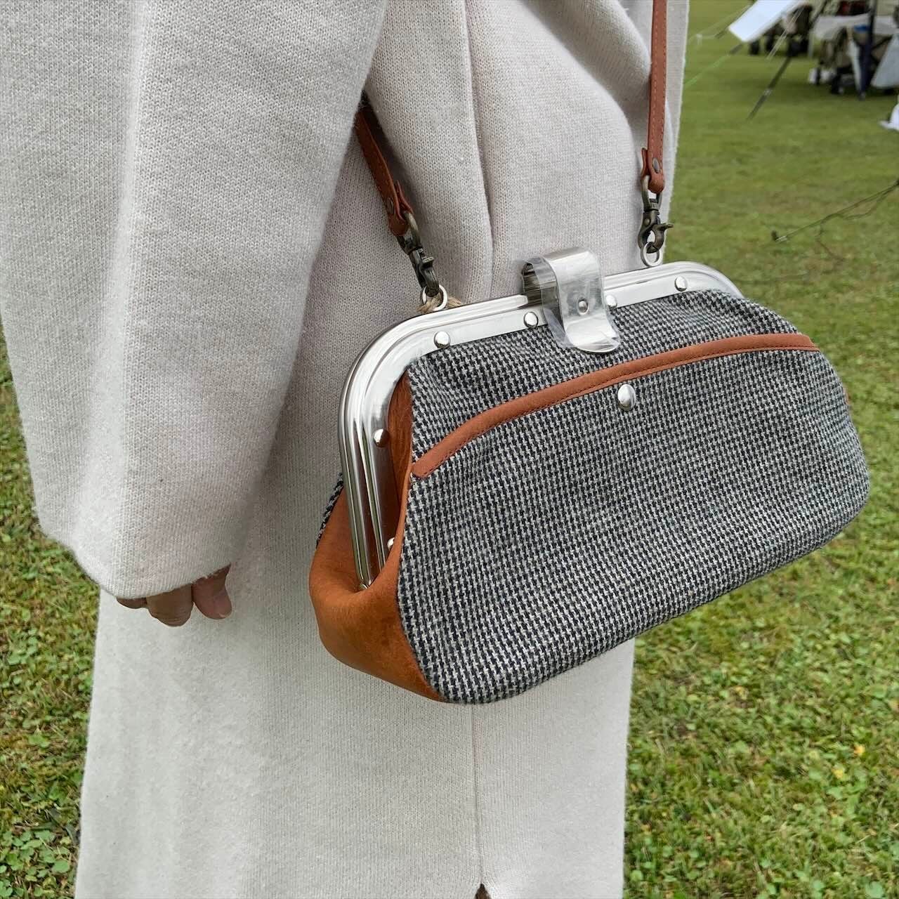 《千鳥格子ツィードxイタリアンレザー》を使用した大人可愛いがま口ショルダーバッグ。